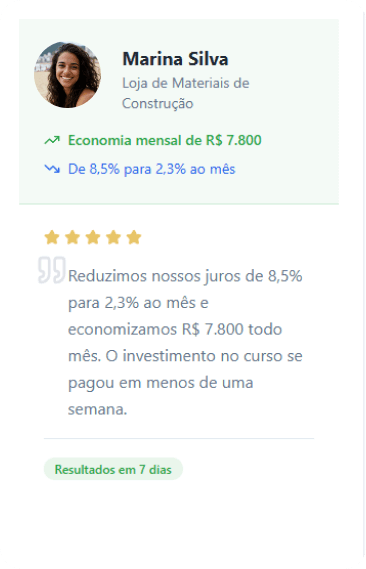 Receba scripts prontos para usar em cada situação: redução de taxas, aumento de limites, renegociação de dívidas e solicitação de novos créditos. Cada palavra foi cuidadosamente escolhida com base na minha experiência dentro do sistema bancário.