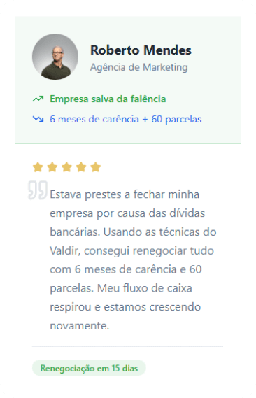 Nos últimos 7 anos, me dediquei a ajudar empresários como você. Já ajudei mais de 3.000 donos de negócios a virarem o jogo contra os bancos, economizando milhões em juros e conseguindo o crédito que realmente merecem.