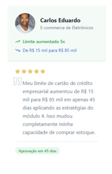 Se você já foi negativado ou está com restrições, este módulo vai mostrar o caminho exato para reconstruir sua credibilidade bancária em tempo recorde, usando técnicas que pouquíssimos empresários conhecem.